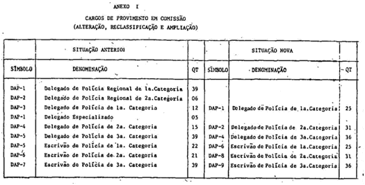 Art. 7º Na forma do disposto no artigo 38 da Lei nº 55, de 18 de janeiro de 1.980, os cargos de provimento em comissão, o objeto dos artigos 1º e 2º desta Lei, serão obrigatoriamente extintos, mediante decreto do Poder Executivo, quando 70% (setenta por cento) dos cargos efetivos criados pelo artigo 13 da mesma Lei nº 55, de 1.980, nas categorias funcionais que integram o Grupo Polícia Civil, forem providos.